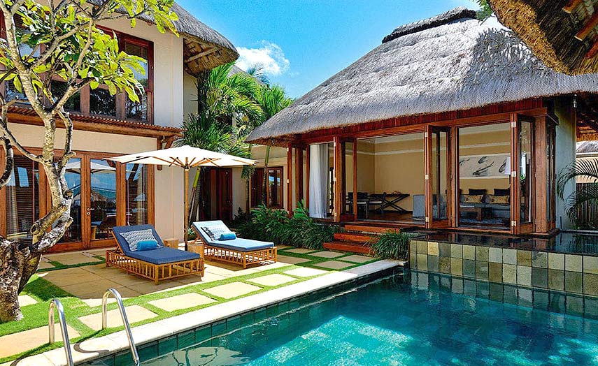 Pool Villen (ca. 375 m2) bieten dieselbe Einrichtung wie die Deluxe Suiten, jedoch mit zusätzlichem Schlaf- und Badezimmer, separatem Check-in, mehr Privatsphäre, Openair-Badezimmer, Gäste-WC, Butlerservice, eigenem Pool und Terrasse mit Gartensicht. Auch buchbar mit Meersicht oder mit zusätzlichem Schlafzimmer und Gartensicht (ca. 525 m2). Buchbar für maximal 6 Erwachsene und 3 Kinder.