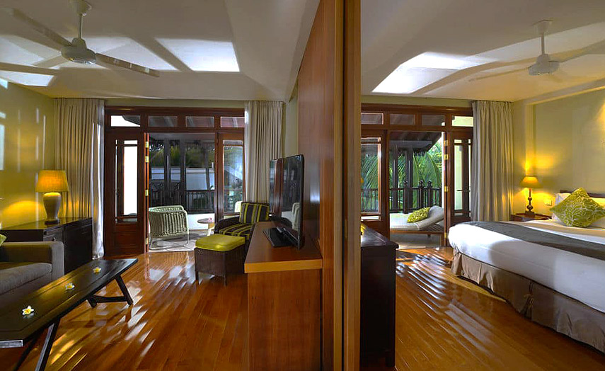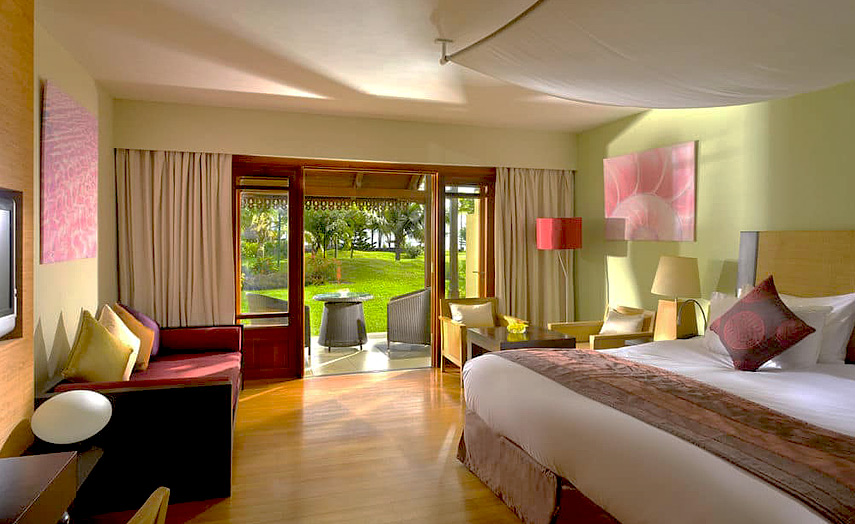 Alle 191 Zimmer, davon 48 Superior Zimmer zum Meer gerichtet und 95 Luxury Zimmer mit Meersicht (50 m²), bieten mit asiatischen Stilelementen höchsten Komfort. Die 42 Family Suiten (75 m²) liegen alle ruhig in einem wunderschönen Garten und bieten einen zusätzlichen Wohnraum mit Sofabett und Dusche/WC. Alle Zimmer sind mit Bad, WC, Klimaanlage, Telefon, Satelliten-TV, Radio, kostenlosem Internetanschluss, Safe, Minibar und Balkon oder Terrasse ausgestattet.